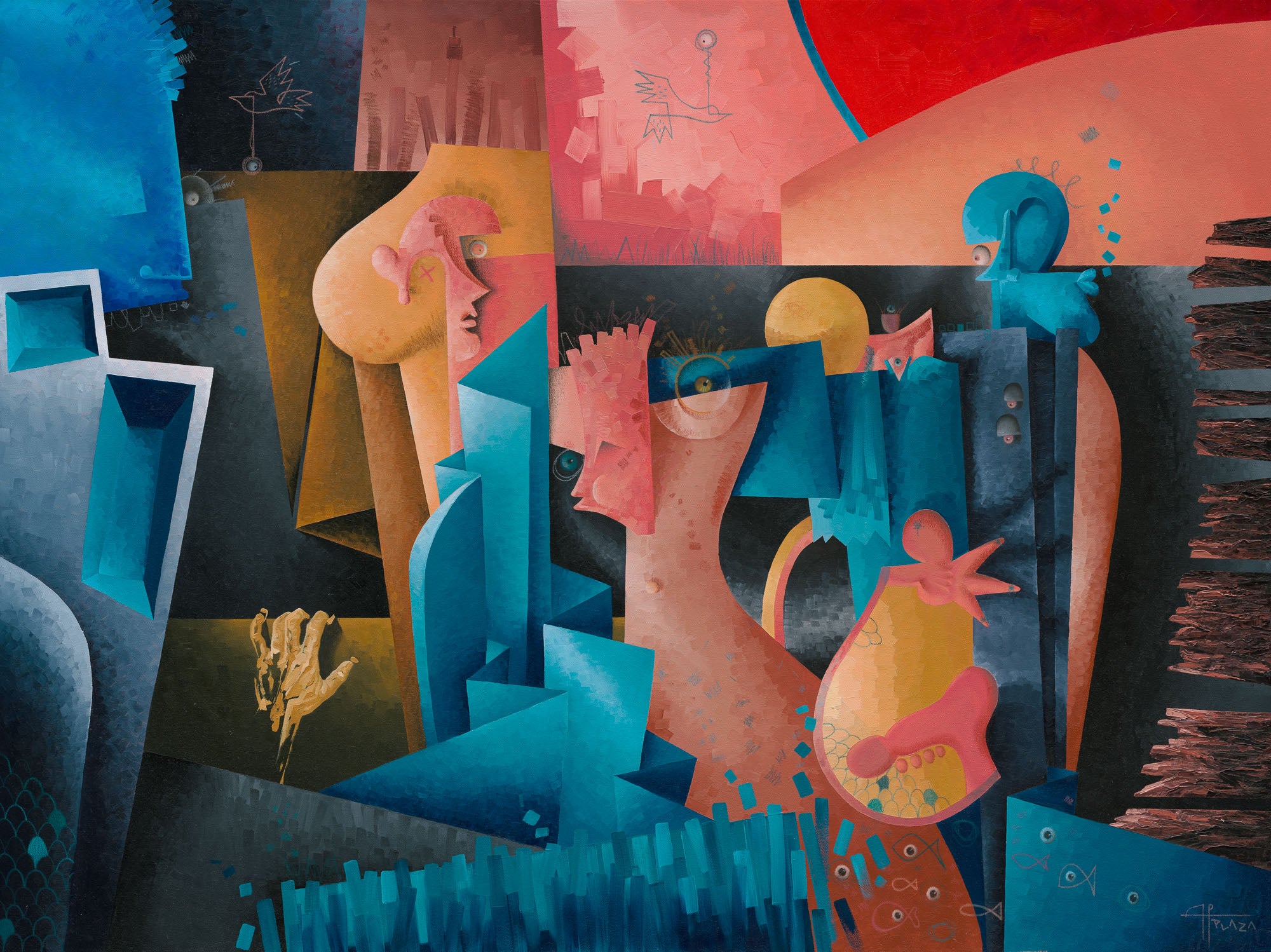 Exploring identity, surveillance, and urban chaos through deconstructed figures and geometric forms.